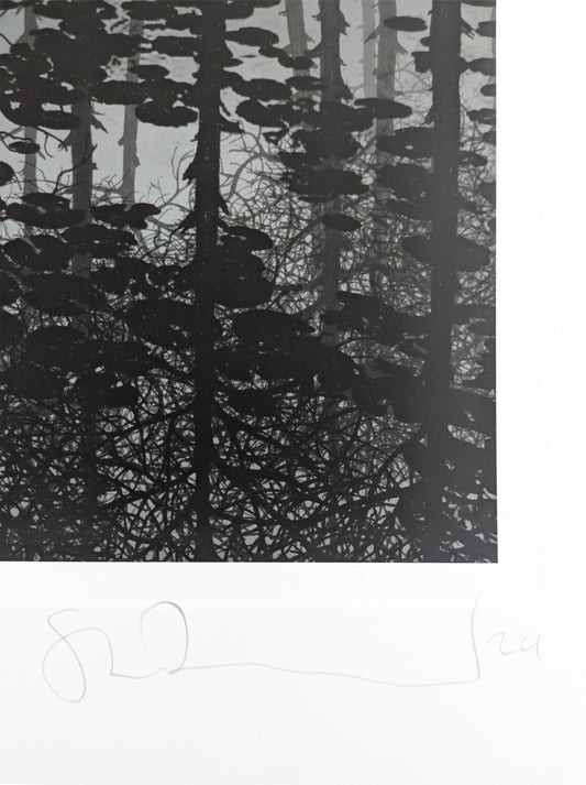 Within this body of work, Donwood presents a selection of evocative tree-lined landscapes with ominous figures looming and uncanny seascapes in the dead of night. These hauntingly beautiful artworks conjure a feeling of nostalgia for a place not yet known, an unattainable ‘Somewhen’.