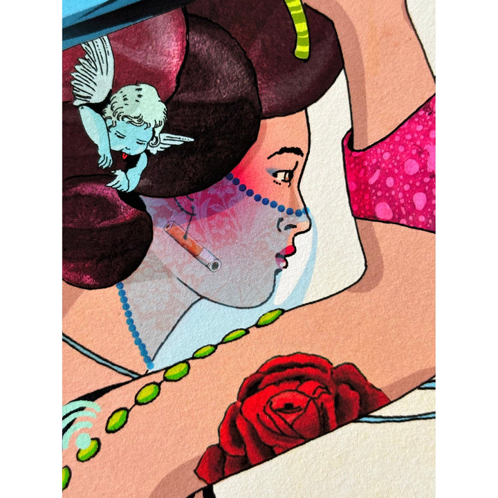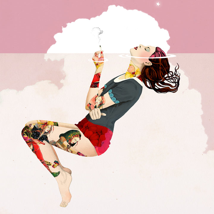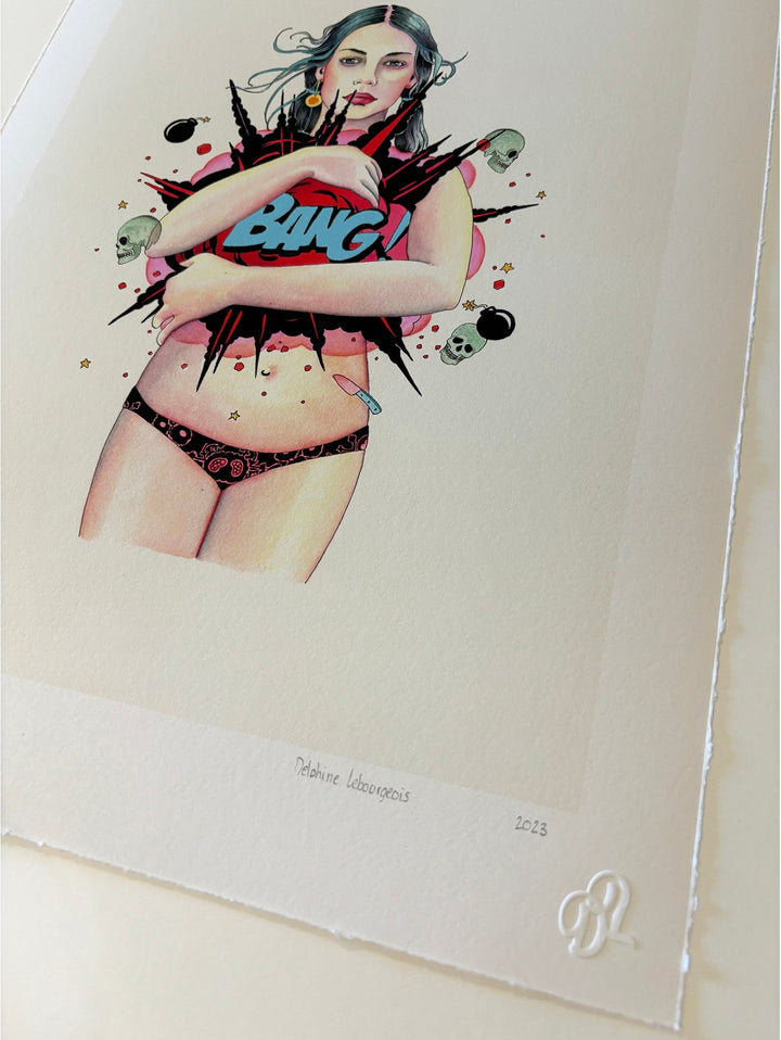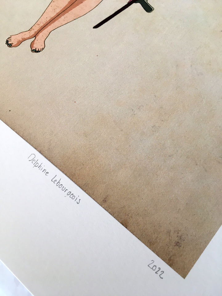 Delphine Lebourgeois studied Fine Art in Lyon then went on to complete a Masters in Illustration at Central St Martins in 2005. She works in various medium including digital, collage, pencil, pen, ink, watercolour and screenprint with drawing at the core of her practice. Recent works draw from various stylistic sources (ranging from Botticelli to comics) mixing symbols and cultural references in a playful and sometimes irreverent way.