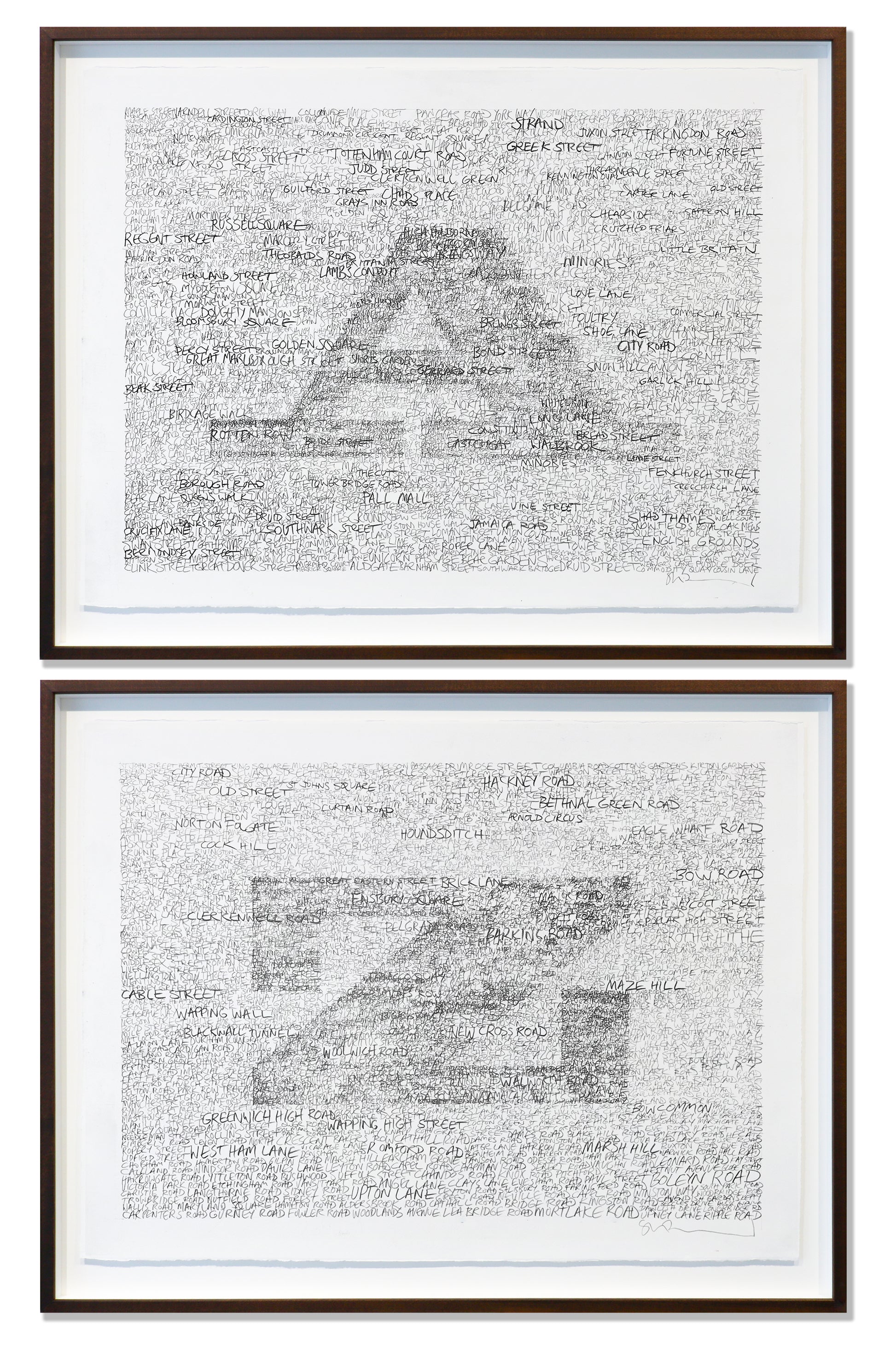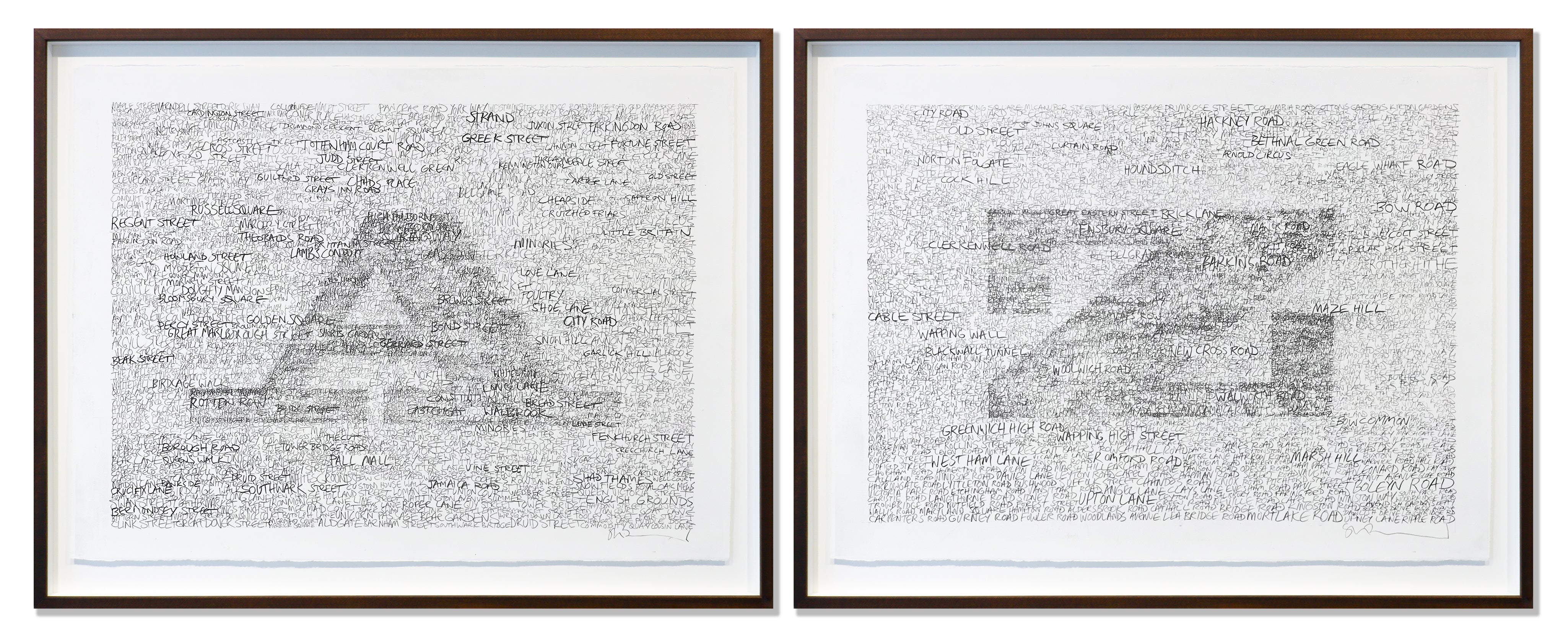 This artwork is sold as a set of 2 pre-framed drawings with anti reflective glass and is currently only available for gallery collection or inner London delivery. If you require delivery in or outside of London, there will be an additional charge. This cost is dependent on your delivery location and will be added during checkout. Framed artwork is 2 x 66 x 84cm |