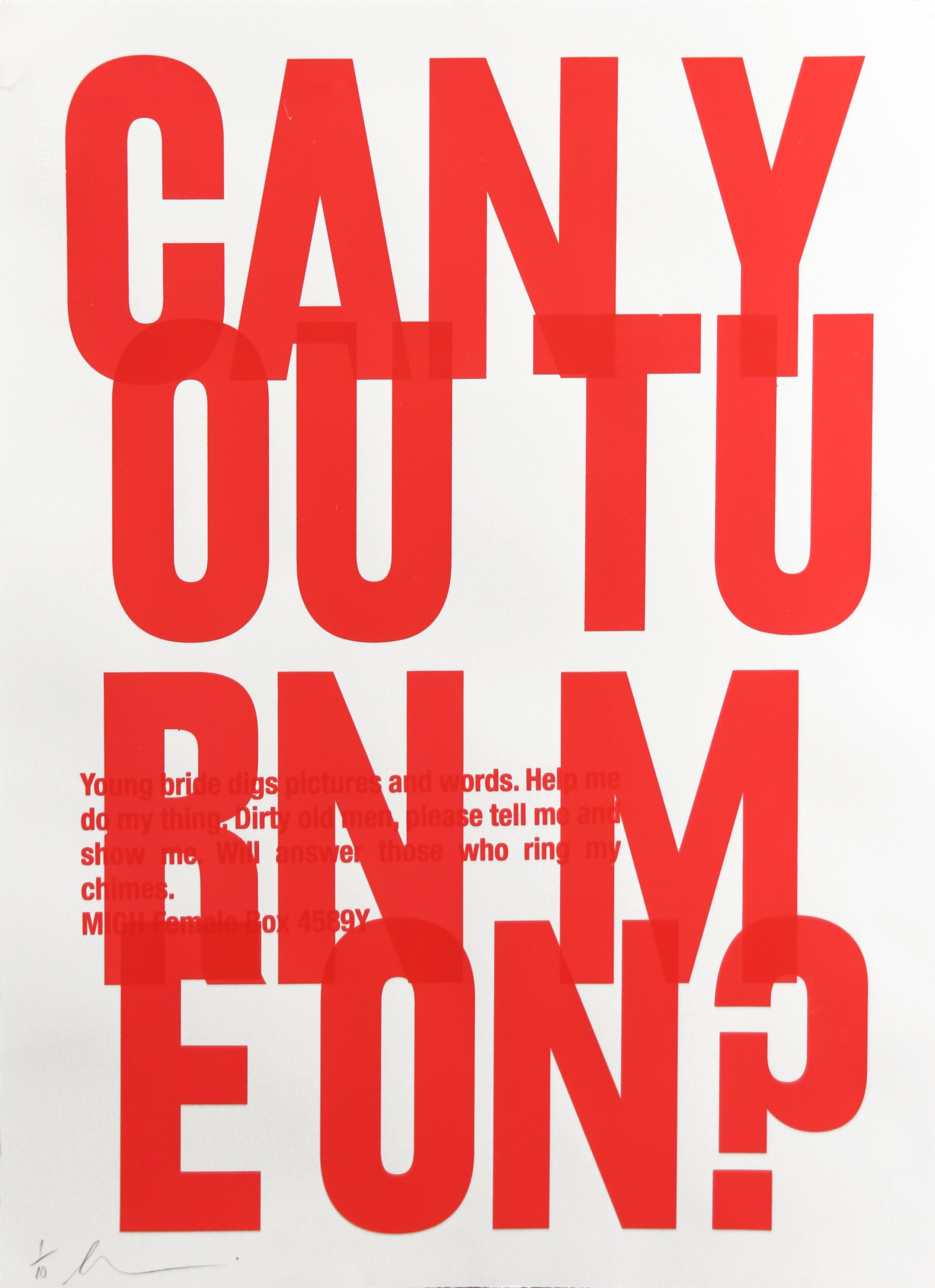 Notes: | This print was created by the artist to be sold singularly or as a pair. The price for a single unframed print is £250 or £450 for the pair and the matching print is titled 'CAN YOU TURN ME ON? (Image)'. This edition was printed by the artist himself and the full edition features slight smudges in the ink and inconsistencies within the print. This was intended throughout the edition and all marks made show and emphasise the hand-made process. |