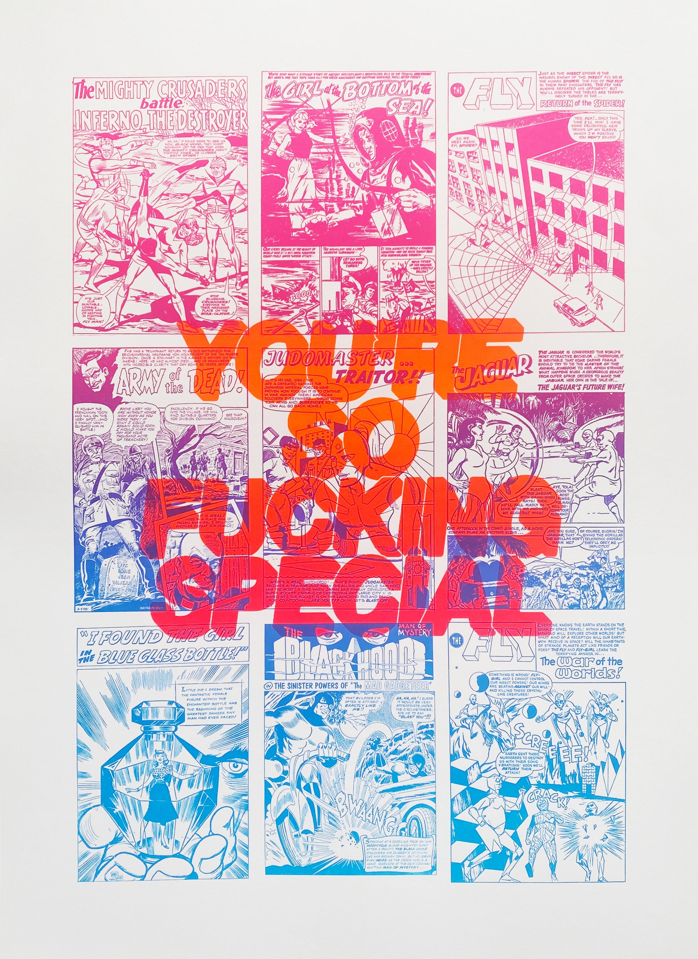 Medium: | 2 Colour Screenprint Blended Faded with Blended Fade Letterpress printed Background, using found vintage 1960 printing plates by Typoretuem |