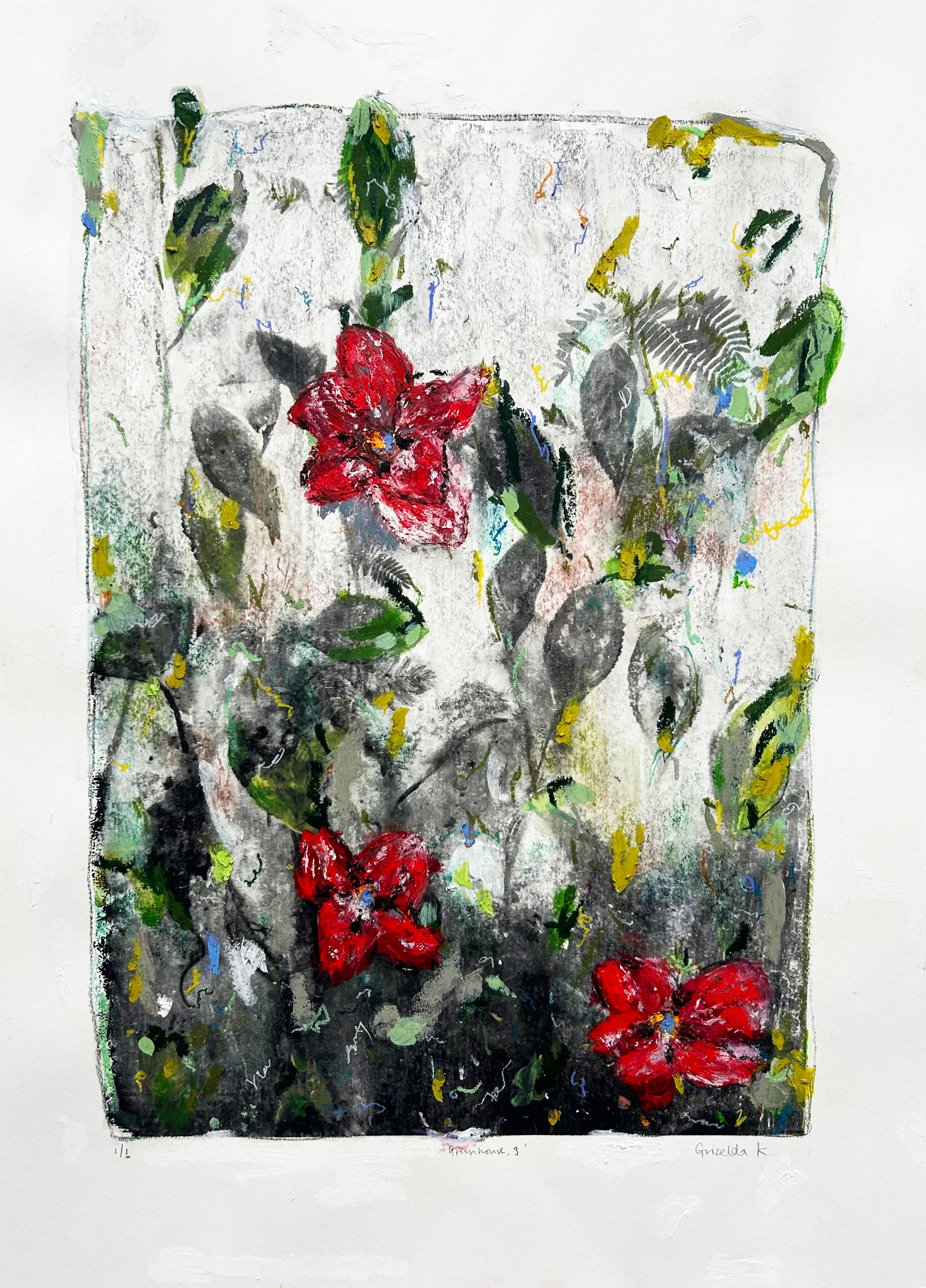1 Colour Screenprint with Unique Oil Pastel and Paint Overlays on Somerset Satin 300gsm Paper |