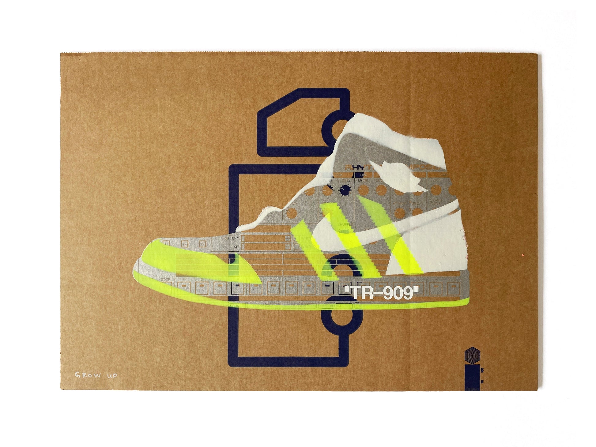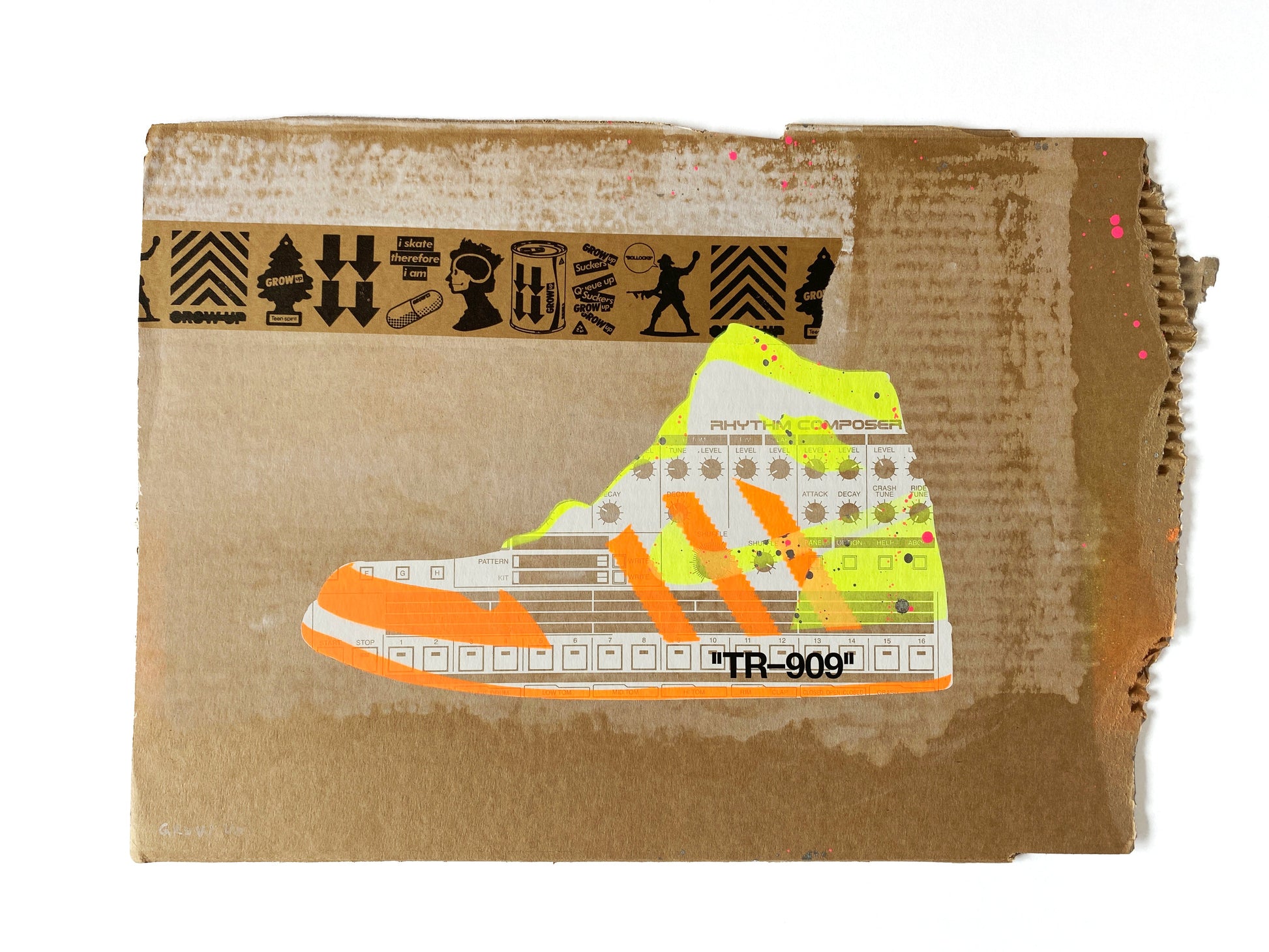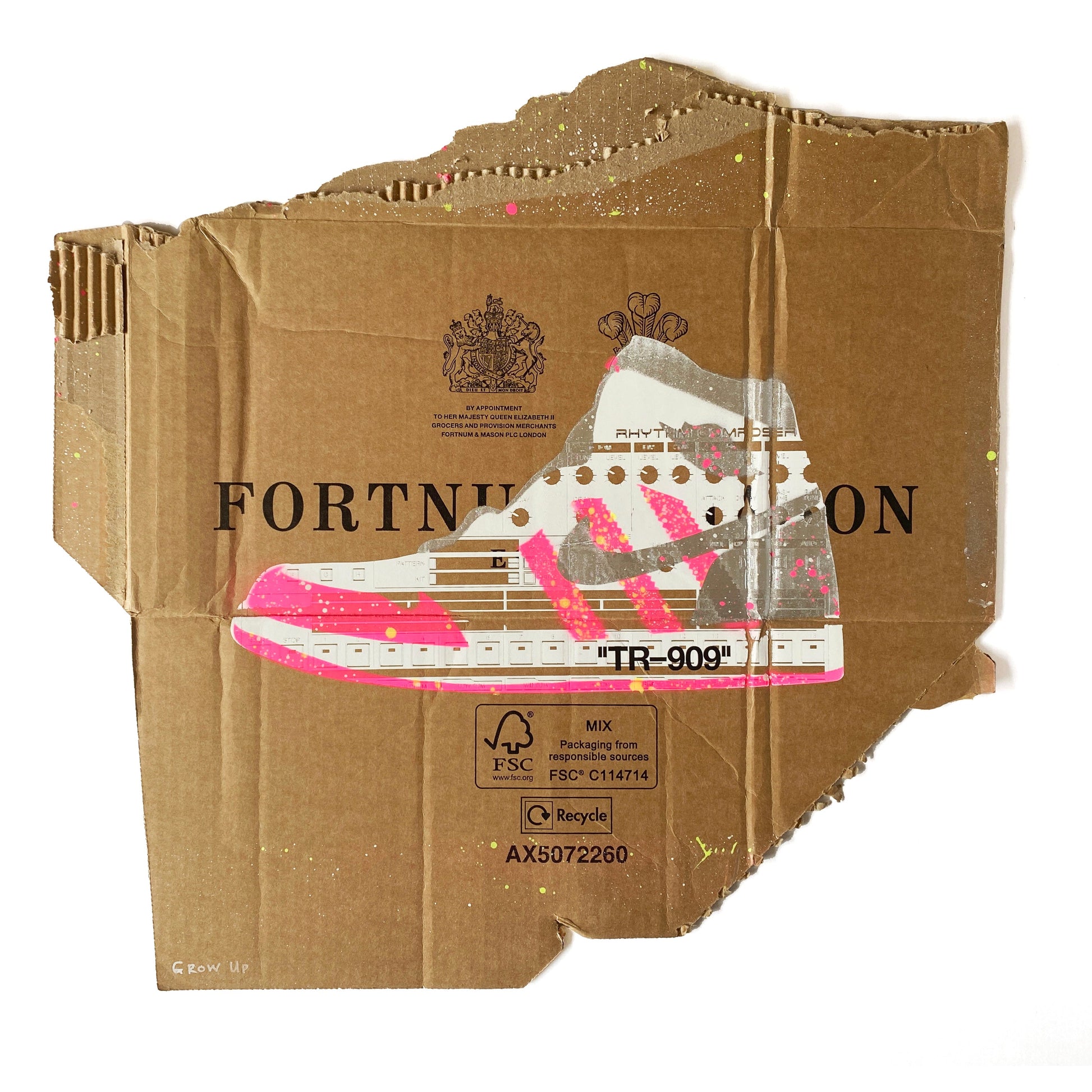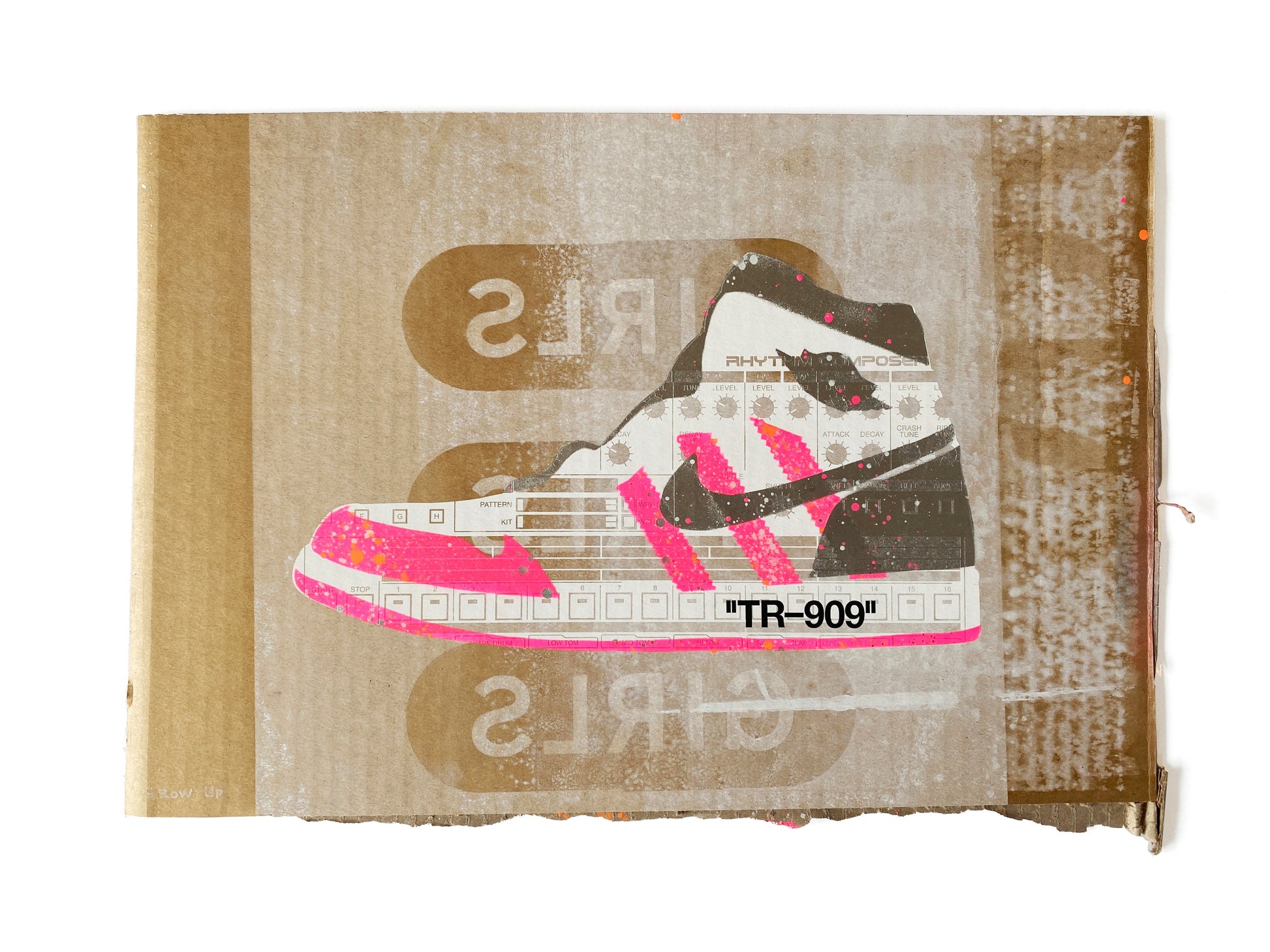 | Medium: | 1 Colour Screen Print with 2 Colour Spray Paint Overlays and Hand-finishing on Recycled Cardboard |