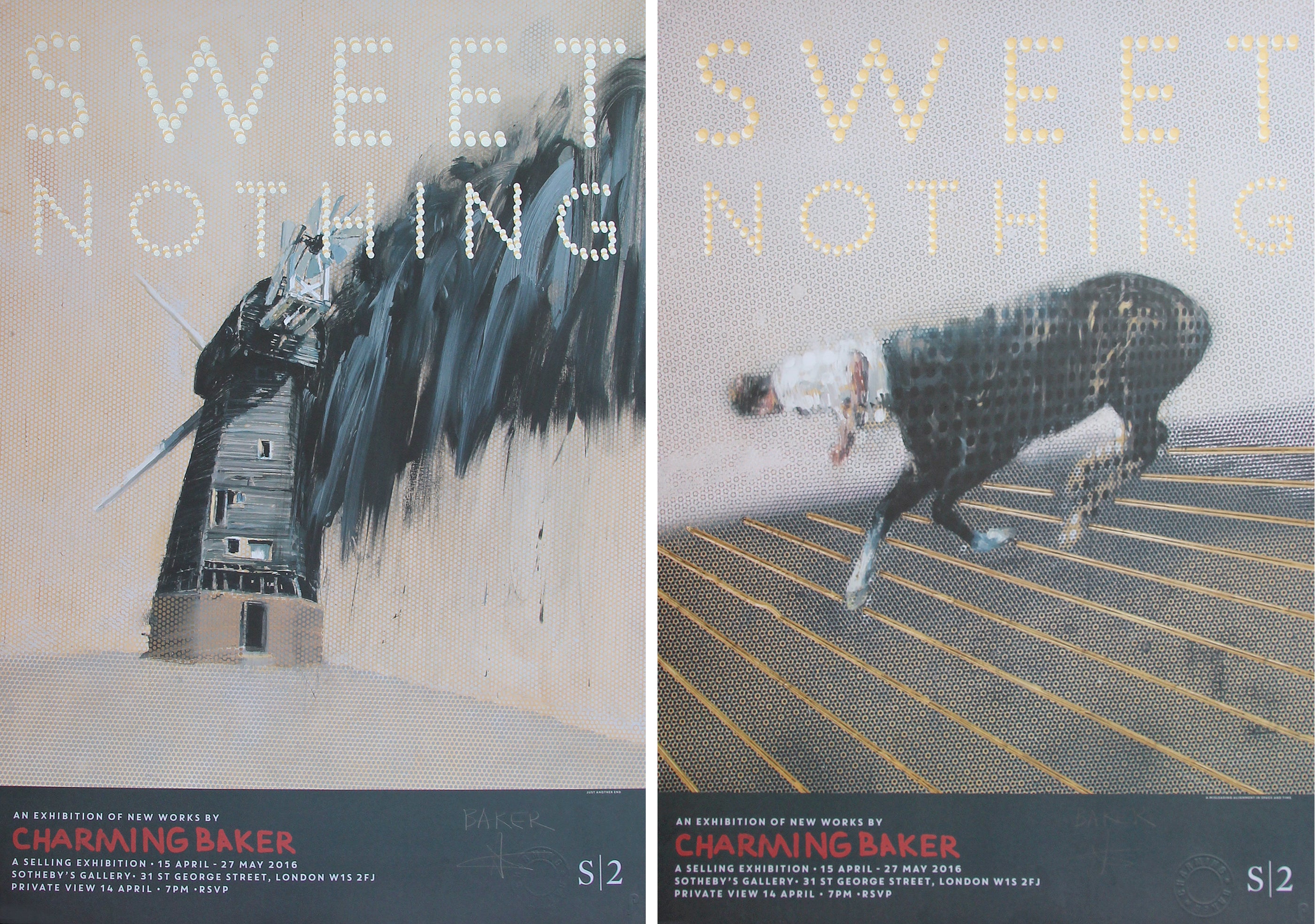 Notes: | 'Sweet Nothing' (silver and gold) are special edition show posters released for Charming Baker's 'Sweet Nothing' solo exhibition held at the iconic Sotheby's S2 gallery on 15th April - 27th May 2016. The posters display two of Baker's new works from the show, 'Just Another End' and 'A Misleading Alignment in Space and Time.' Both posters are signed and numbered and only available to buy as a pair. Please note both posters will be of the same edition number when sold. We also have 10 A/P editions available at £250 for the pair, available here. |