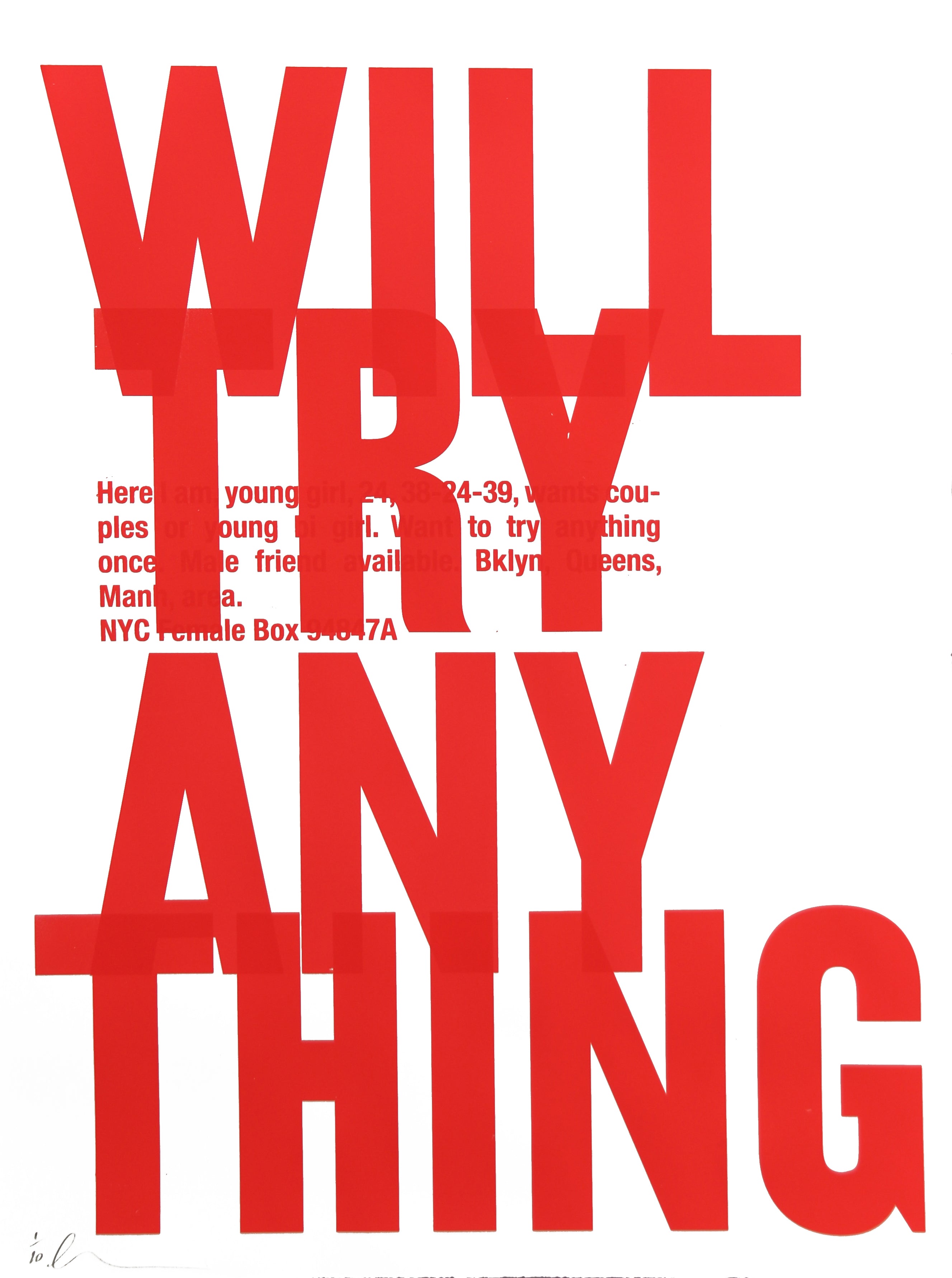 Notes: | This print was created by the artist to be sold singularly or as a pair. The price for a single unframed print is £250 or £450 for the pair and the matching print is titled 'WILL TRY ANYTHING (Image)'. This edition was printed by the artist himself and the full edition features slight smudges in the ink and inconsistencies within the print. This was intended throughout the edition and all marks made show and emphasise the hand-made process. |